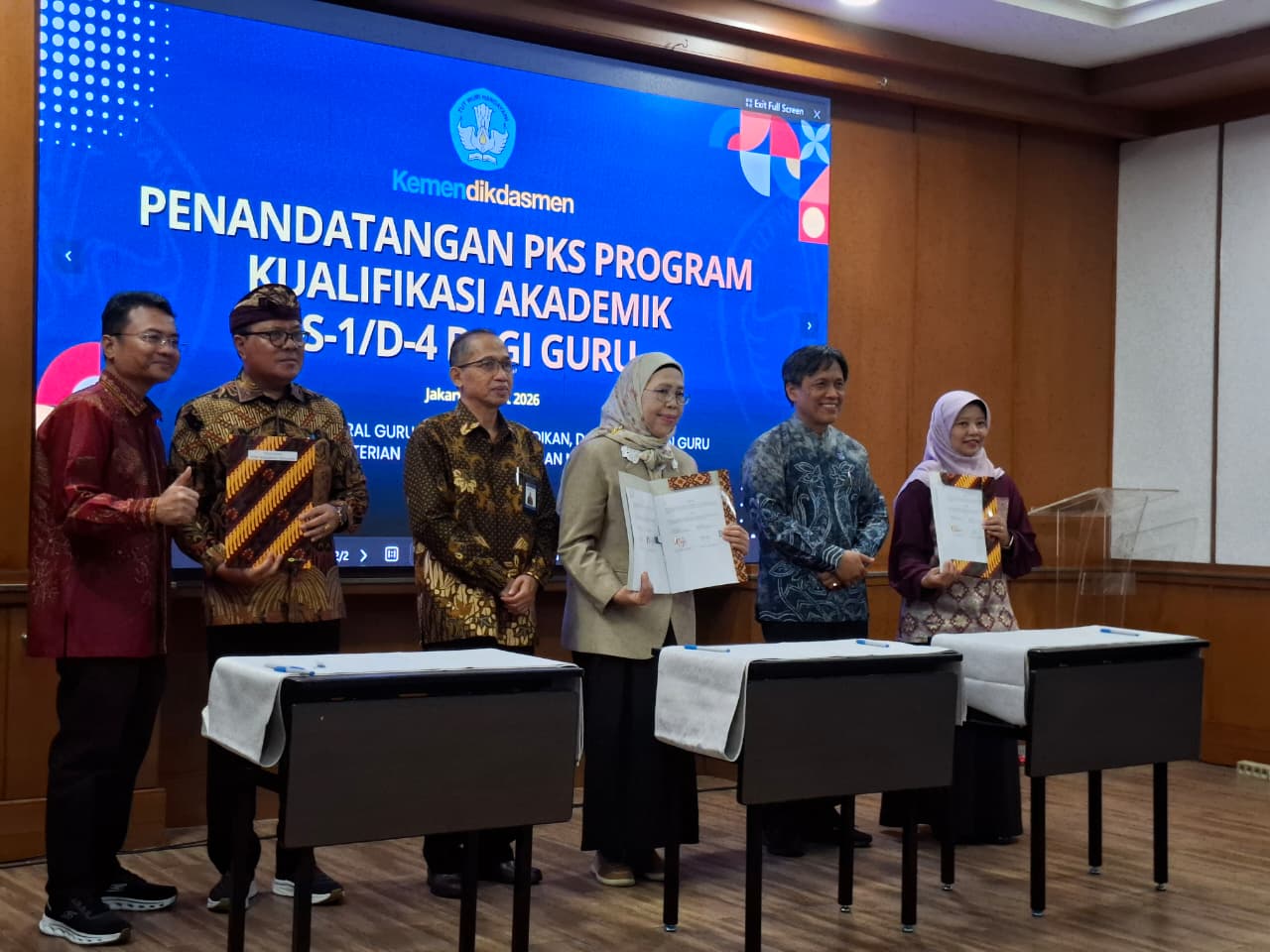 Jakarta, 7 Maret 2026 - Dalam rangka memperkuat kualifikasi guru, Kementerian Pendidikan Dasar dan Menengah (Kemendikdasmen) melalui Direktorat Jenderal Guru, Tenaga Kependidikan, dan Pendidikan Guru (Ditjen GTKPG) melakukan penandatanganan Perjanjian Kerja Sama (PKS) dengan 113 Lembaga Pendidikan Tenaga Kependidikan (LPTK) terkait program Pemenuhan Kualifikasi Akademik S-1/D-IV bagi guru.